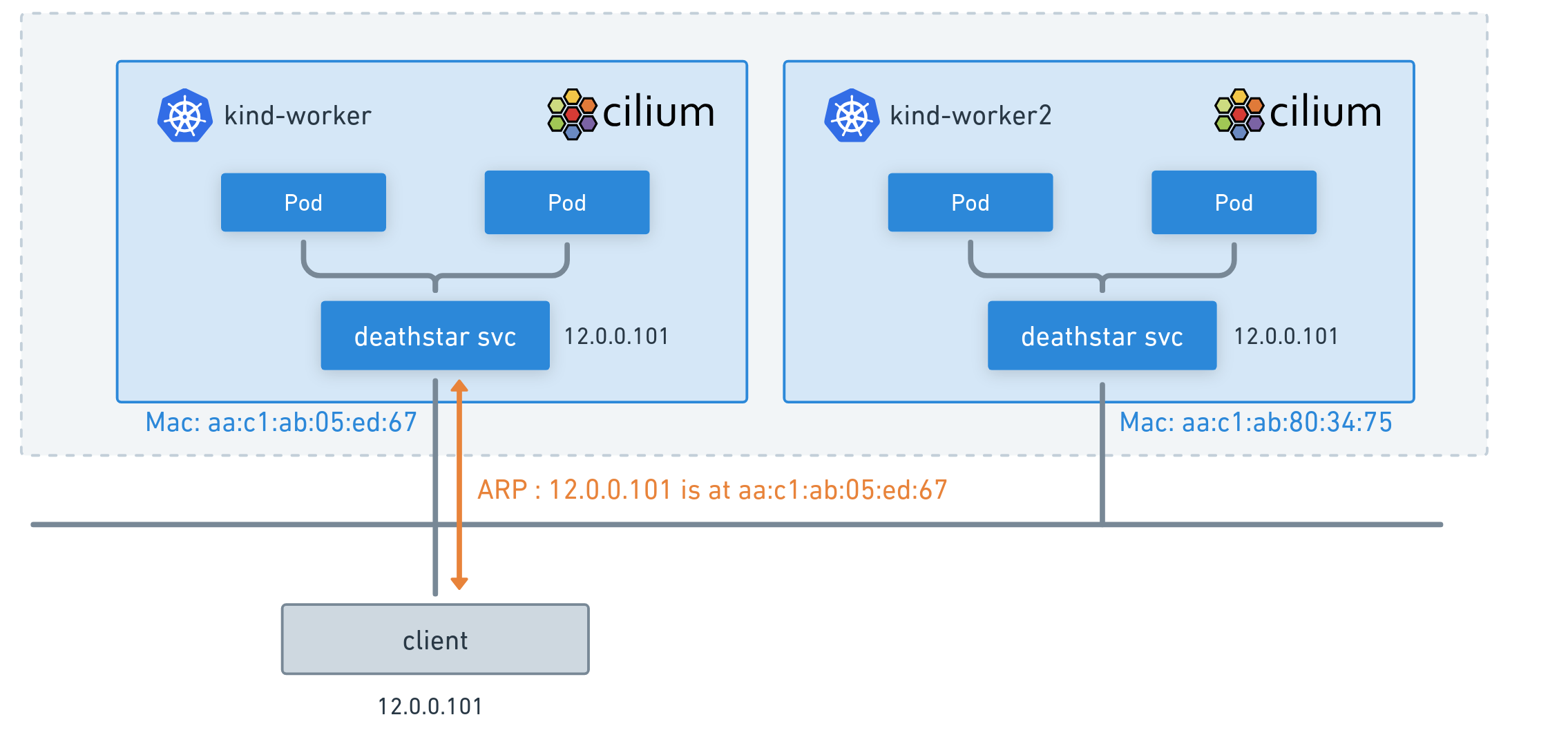 The Cilium node will reply back to the client with its own MAC address (“12.0.0.101 is at aa:c1:ab:05:ed:67”).