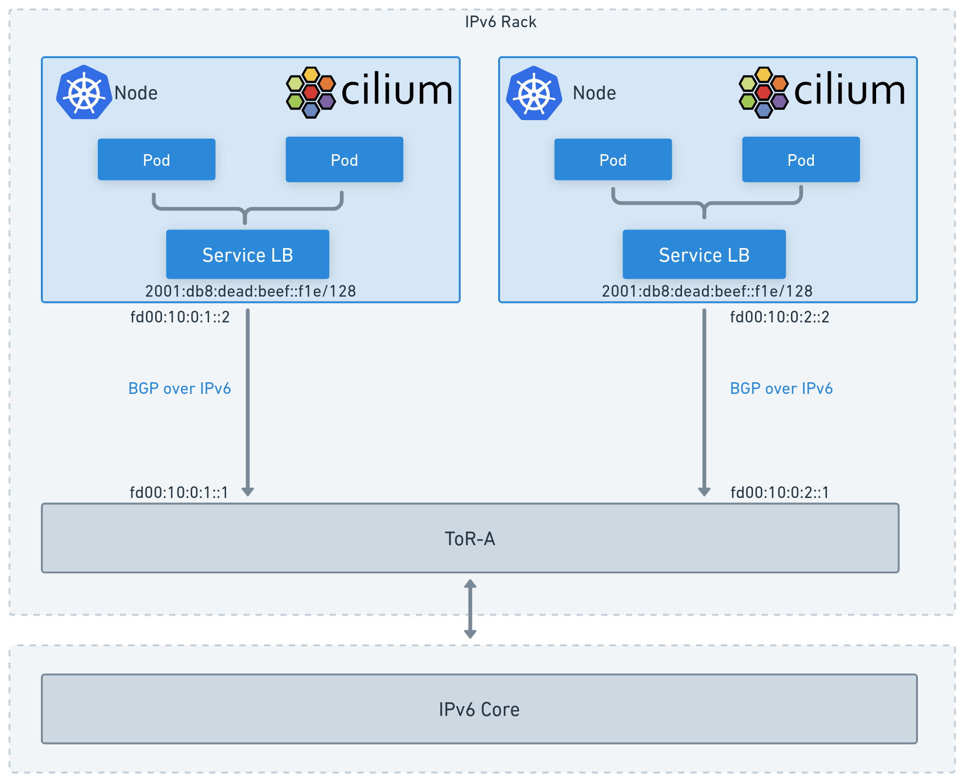The examples so far focused on IPv4 but both LB-IPAM and BGP on Cilium support IPv6.