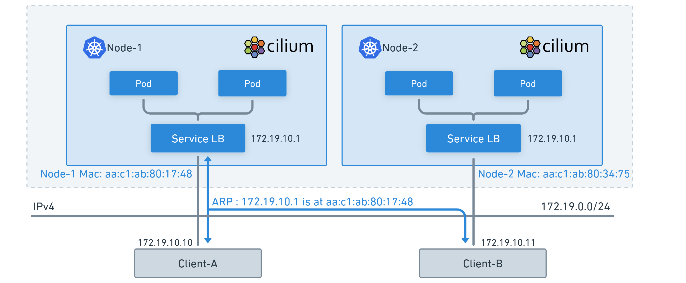 In the image above, our clients Client-A and Client-B are located on the same network as the Kubernetes LoadBalancer Service. In this case, BGP is superfluous; the clients simply need to understand which MAC address is associated with the IP address of our service so that they know to which host they need to send the traffic to.